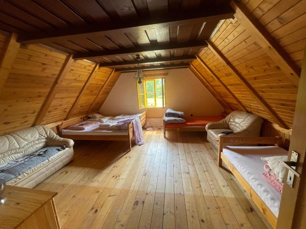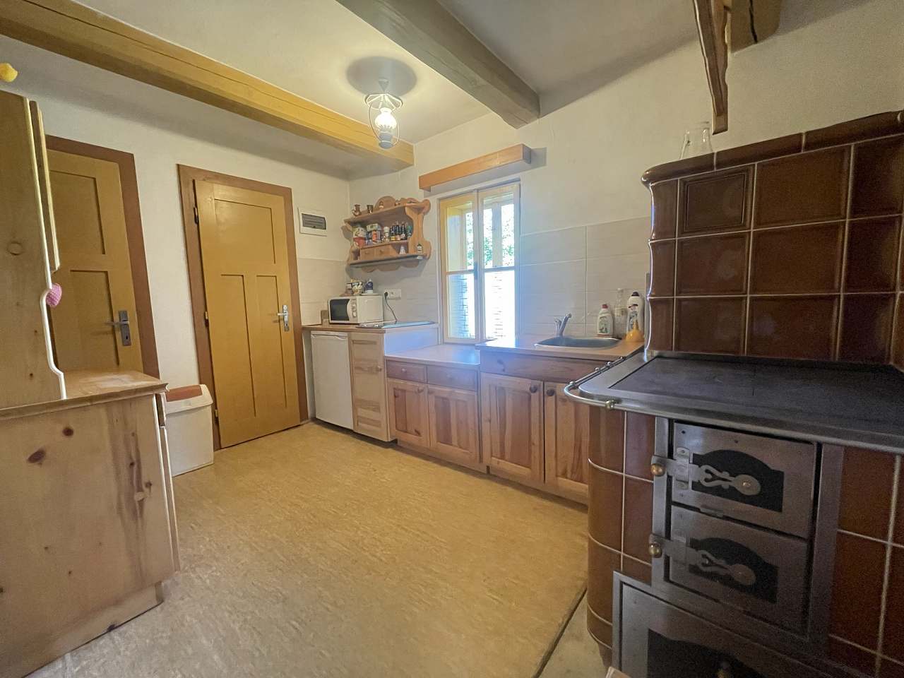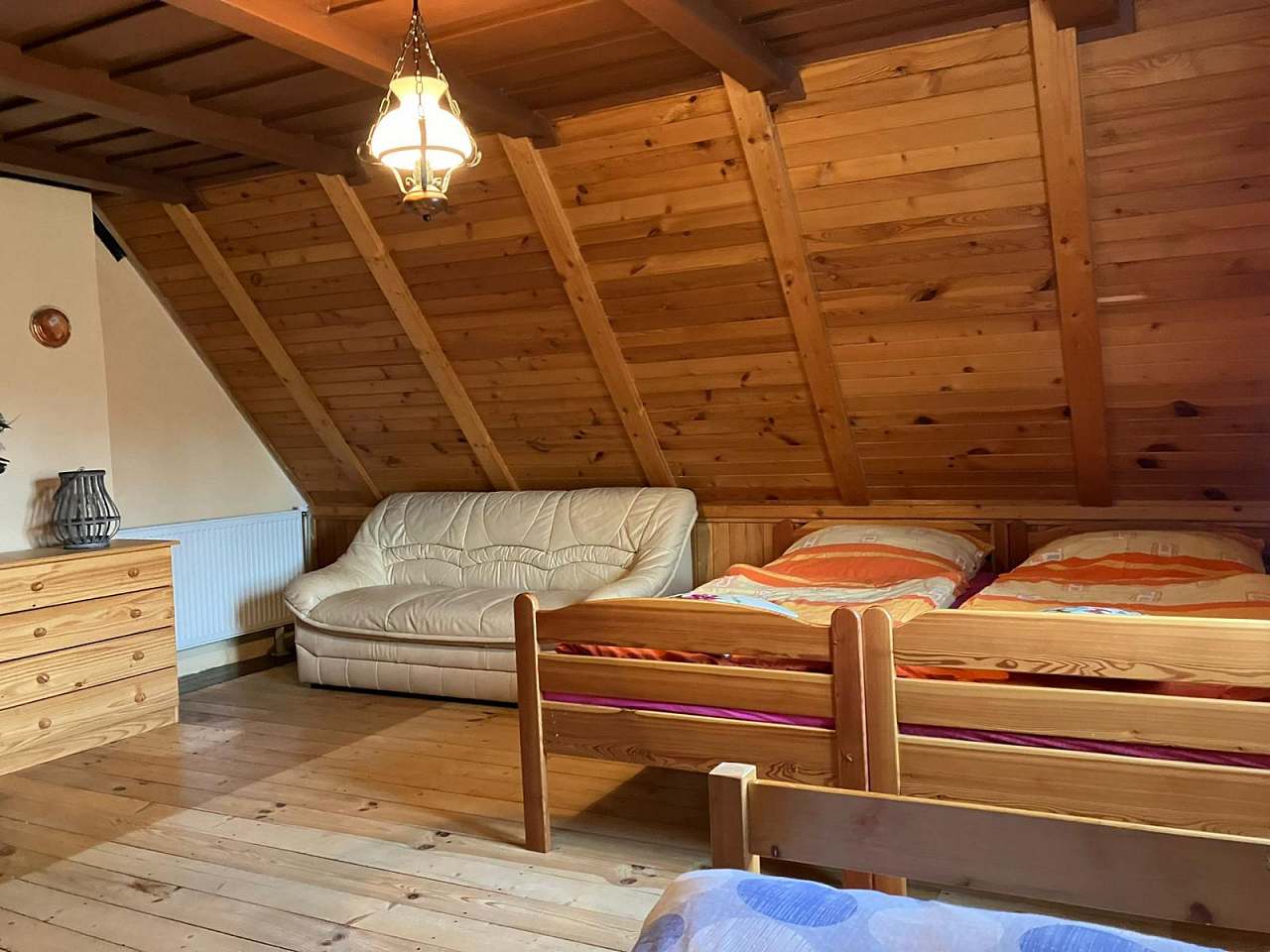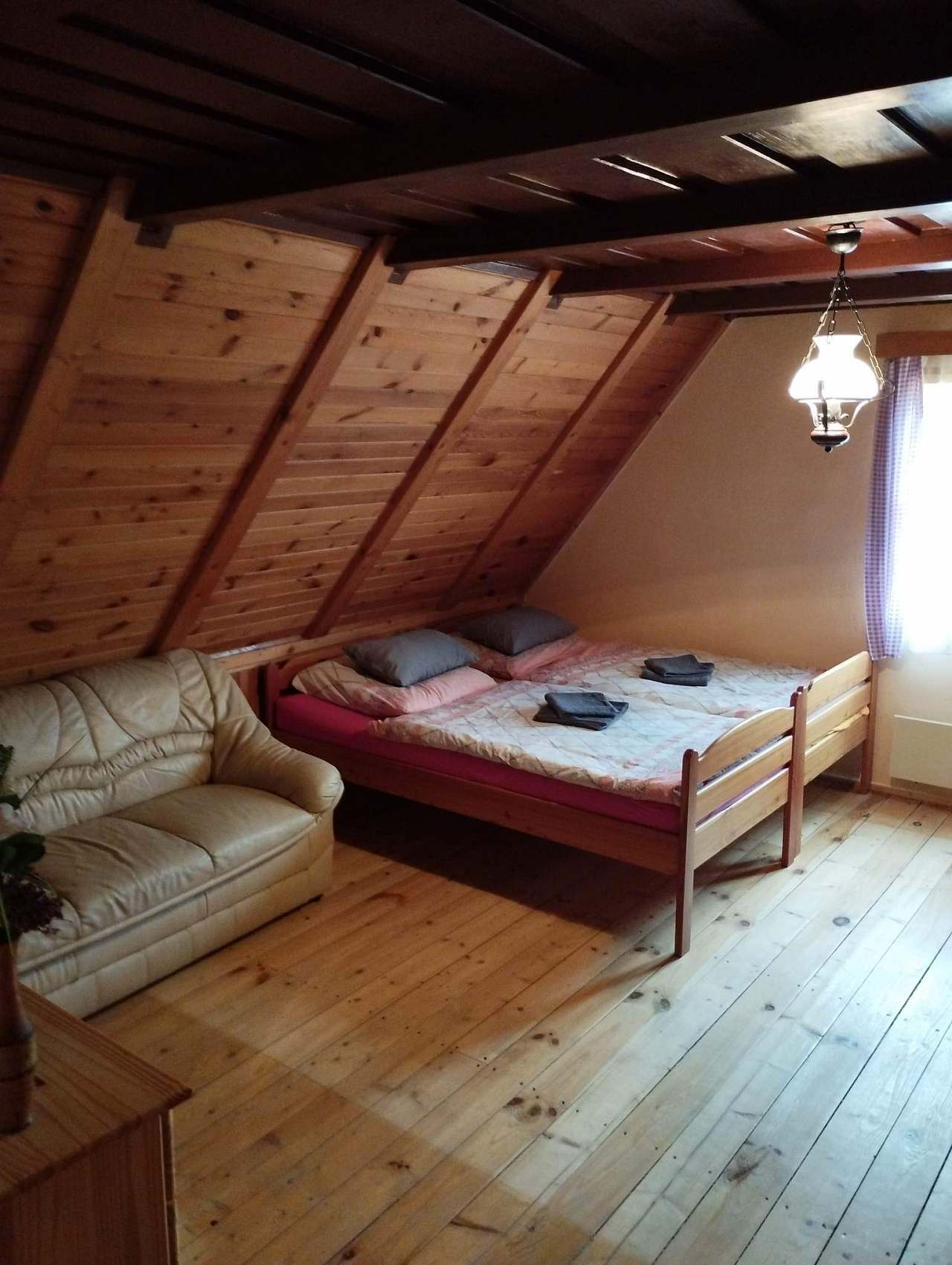 Chalupa poskytuje příjemné zázemí pro 1 až 9 osob ve třech útulných ložnicích. K dispozici je velký obývací pokoj, kuchyň vybavená kompletním nádobím, lednicí, troubou a mikrovlnnou troubou. Vytápění zajišťuje stylový krb na dřevo s rozvodem tepla do celé chalupy a kachlová kamna v kuchyni, kde si můžete uvařit i na ohni.